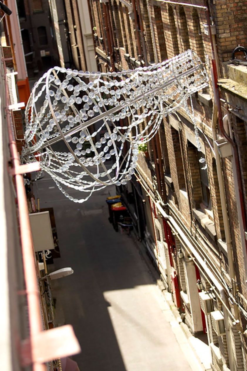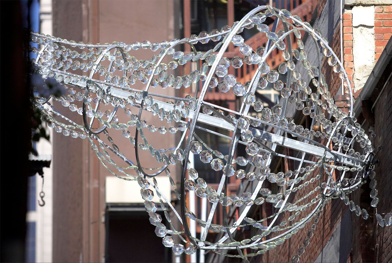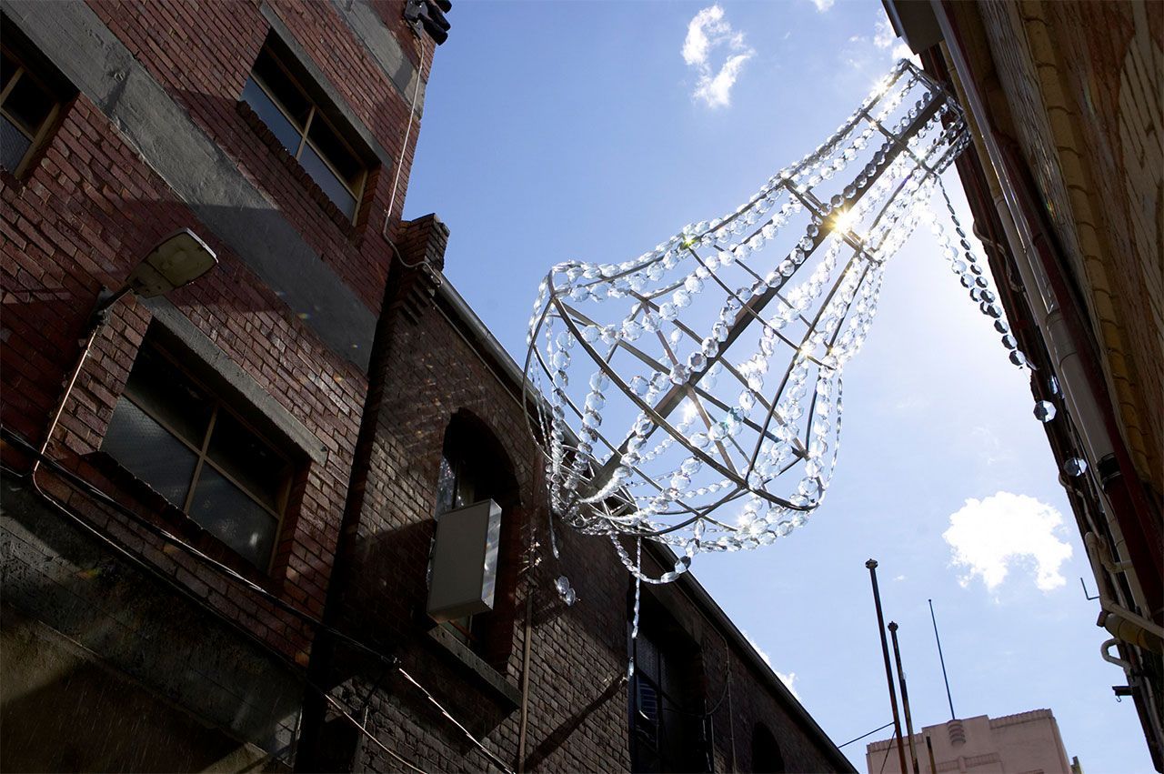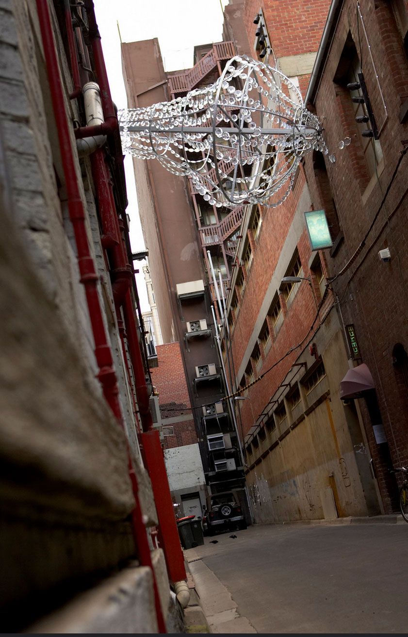 During the day, this chandelier glistens and reflects the laneway’s changing light qualities; at night it lights up, illuminating its dank surrounds.