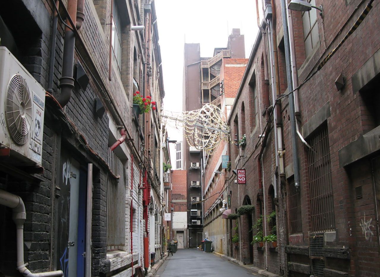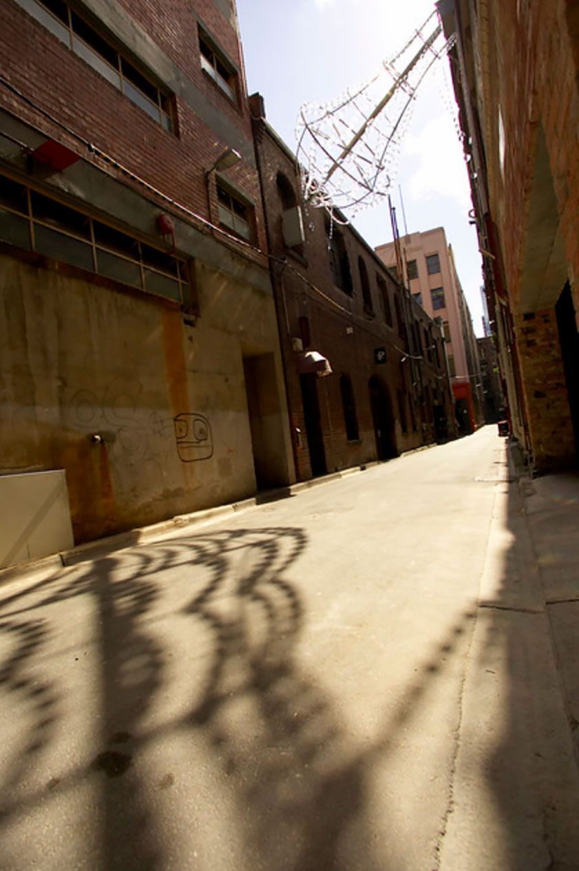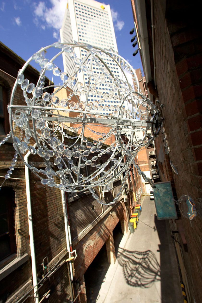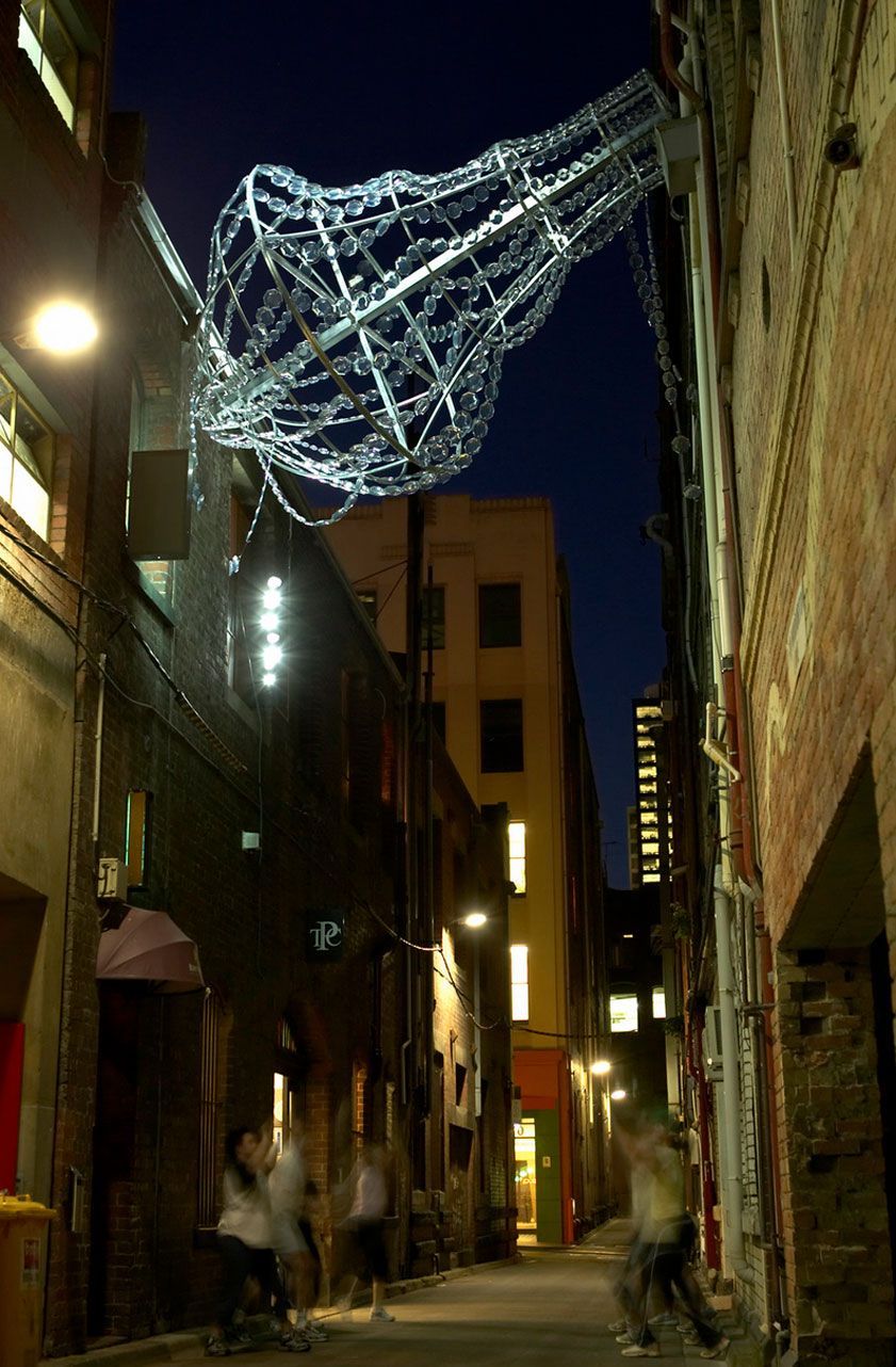 During the day, this chandelier glistens and reflects the laneway’s changing light qualities; at night it lights up, illuminating its dank surrounds.