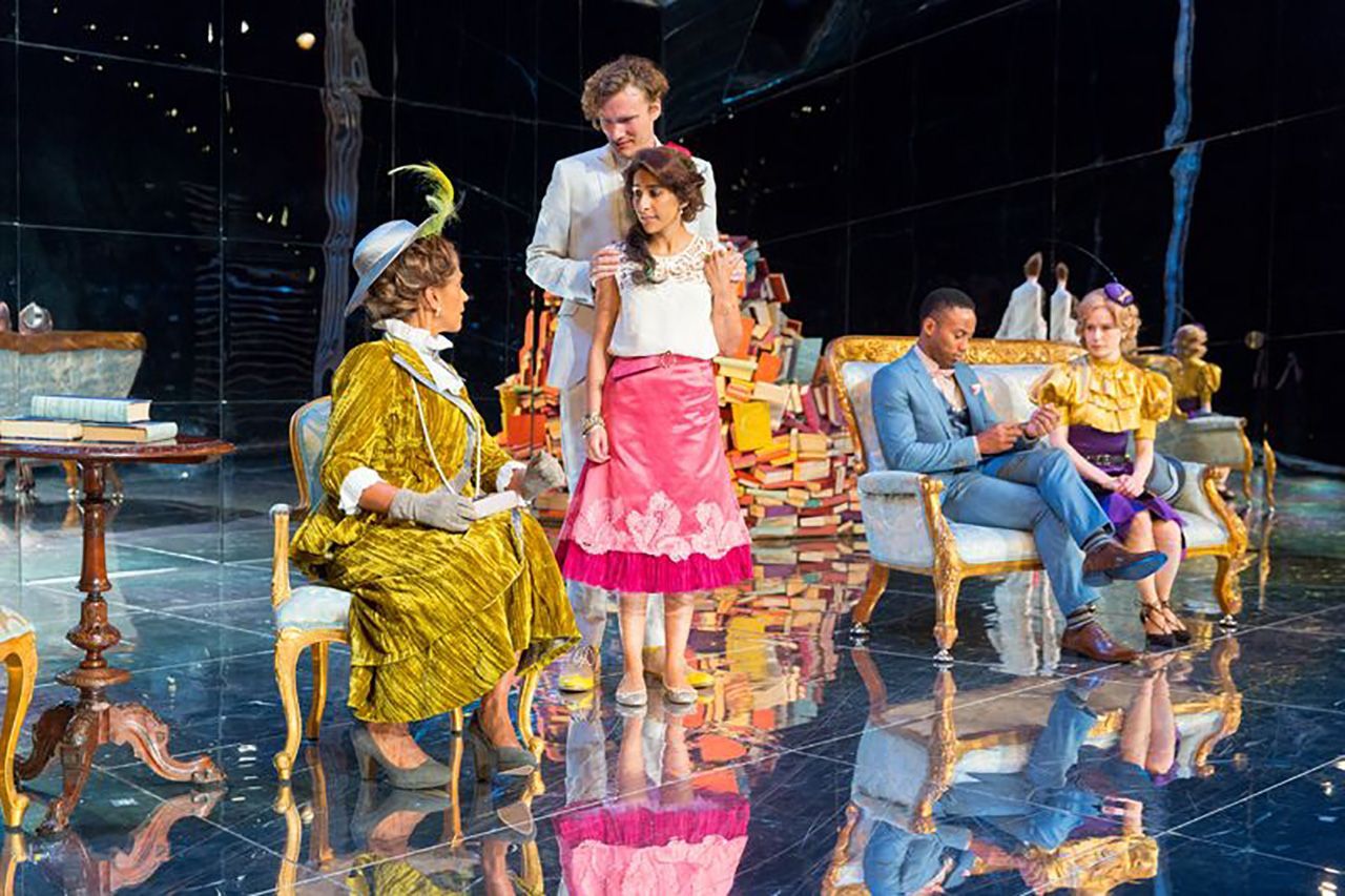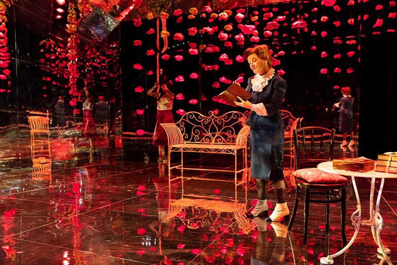 “Shaw’s set is stripped-back but effective, with cascading lines of faux flowers for the garden scenes, two pyramids of fairy-lit books in the morning room and sumptuous chaise lounges in the drawing room.”